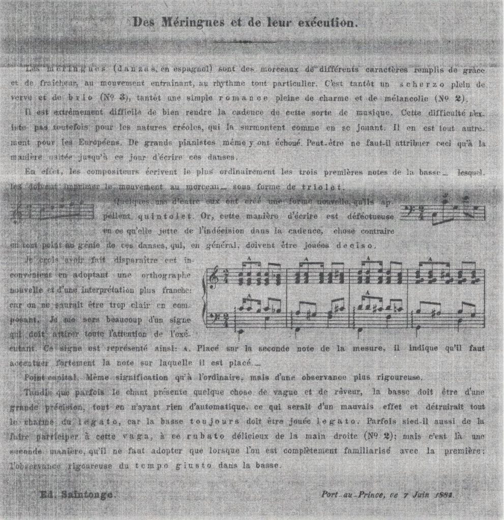 It is extremely difficult to accurately render the pace of this sort of music. This difficulty does not exist altogether for the native creoles who overcome it as it is played. It is altogether otherwise for Europeans. Formidable pianists themselves avoid it. Perhaps one should not attribute this but to the arduous manner in which to this day these dances are notated.